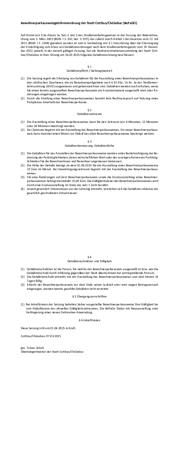 Bewohnerparkausweisgebührenordnung 2025