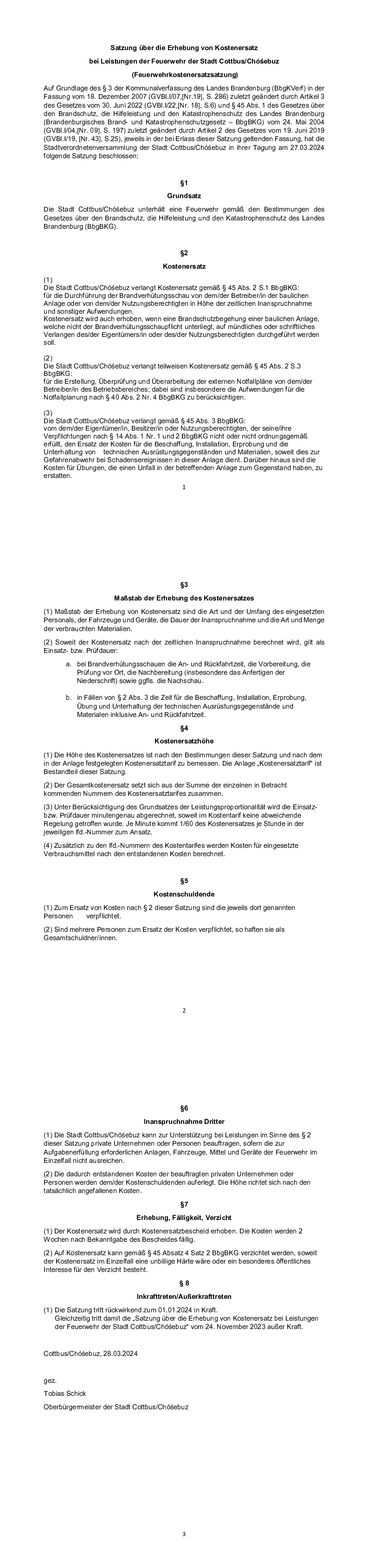 - Satzung über die Erhebung von Kostenersatz bei Leistungen der Feuerwehr der Stadt Cottbus/Chóśebuz (Feuerwehrkostenersatzsatzung) Inkrafttreten: 01.01.2024Außerkrafttreten: 13.04.2024