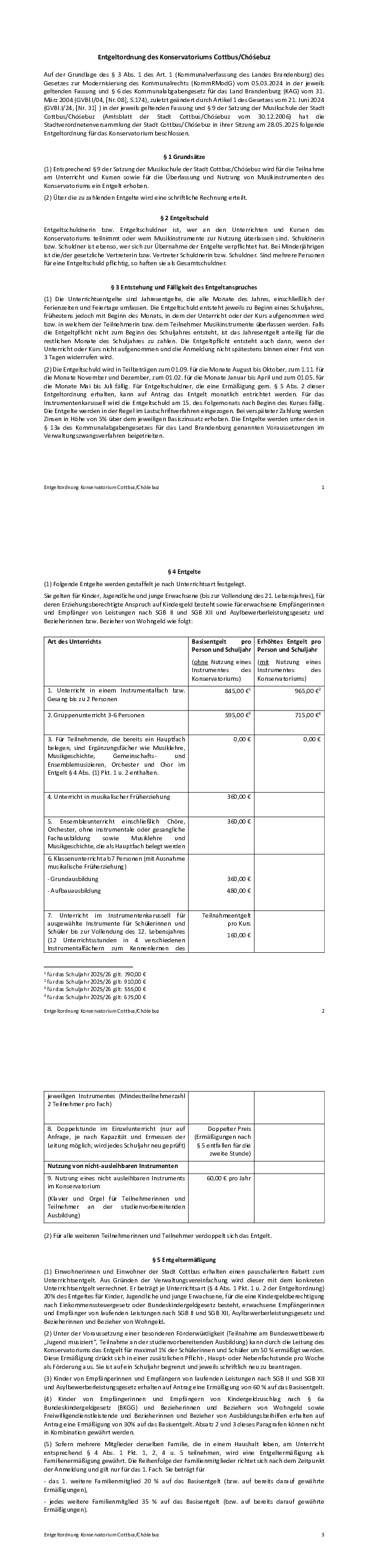 Entgeltordnung des Konservatoriums Cottbus-Chóśebuz