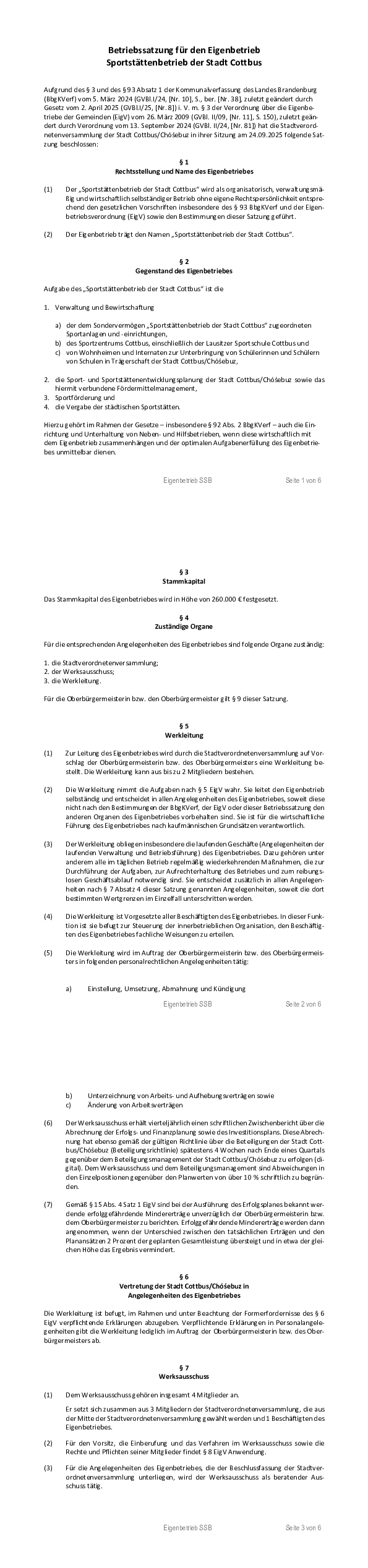 Betriebssatzung des Eigenbetriebes Sportstättenbetrieb der Stadt Cottbus (SSB)
