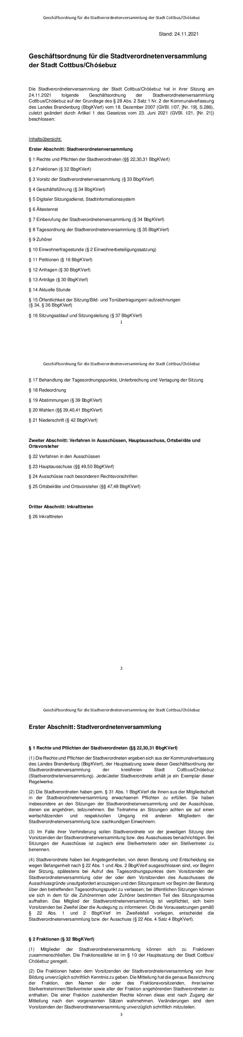Die Geschäftsordnung der Stadtverordnetenversammlung Cottbus/Chóśebuz regelt die Abläufe und Verfahren innerhalb des Gremiums. Sie legt fest, wie Sitzungen ablaufen, welche Rechte und Pflichten die Mitglieder haben und wie Entscheidungen getroffen werden. Ziel ist eine transparente und effiziente Arbeitsweise der kommunalen Selbstverwaltung. Das vollständige Dokument steht als PDF zum Download bereit.