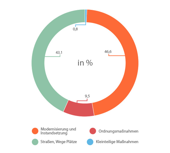 Das nachfolgende Diagramm verdeutlicht die Verteilung der eingesetzten Fördermittel auf die entsprechenden Handlungsfelder der Städtebauförderung: