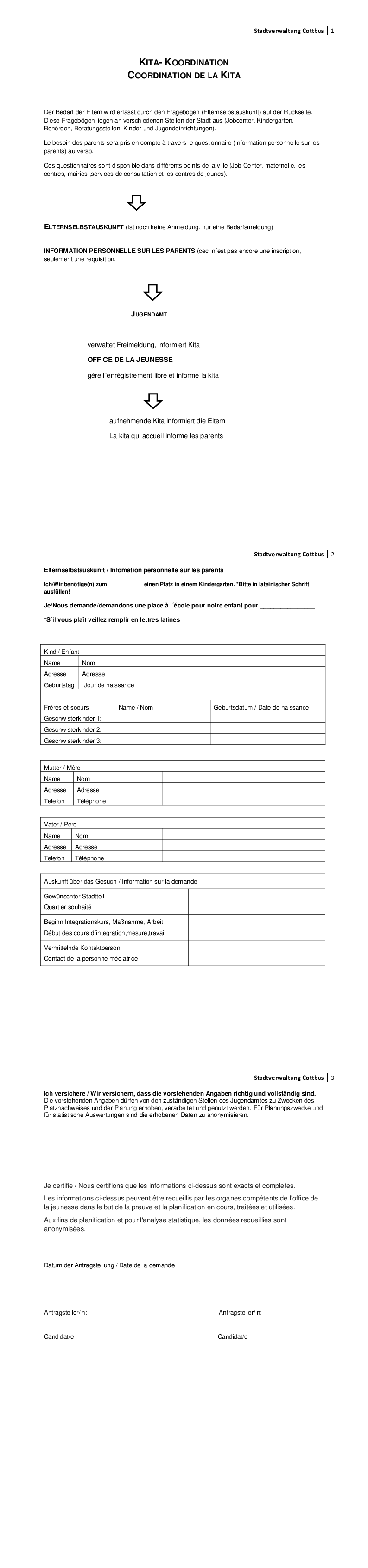 Der Bedarf der Eltern wird durch den hier zur Verfügung gestellten Fragebogen (Elternselbstauskunft) erfasst. Es handelt sich dabei noch nicht um die Anmeldung des Kindes in einer bestimmten Kita.