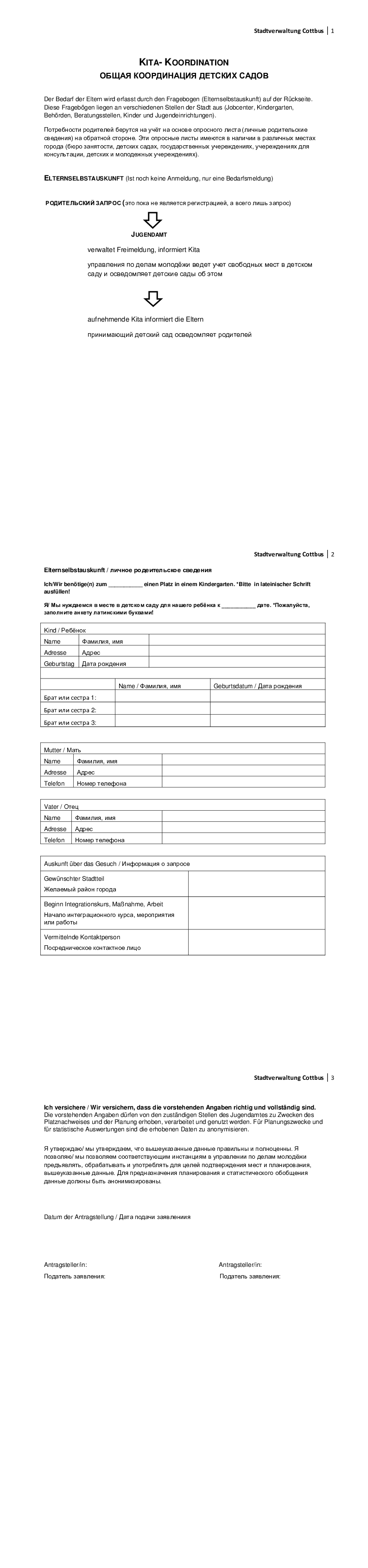 Ziel der Stadt Cottbus ist es, Flüchtlingskinder und -jugendliche nach Ankunft in unserer Stadt schnellstmöglich zu integrieren, hierzu zählt auch der Besuch einer Kindertagesstätte. Die hier in verschiedenen Sprachen zum Download zur Verfügung stehenden Formulare sind ein Hilfsmittel, um die Anmeldeformalitäten trotz Sprachbarrieren rechtssicher und auch für die Geflüchteten verständlich vorzunehmen.
