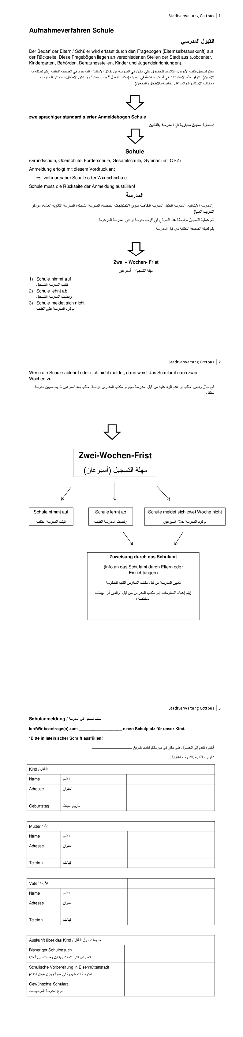 Der Bedarf der Eltern/Schüler wird durch den hier zur Verfügung gestellten Fragebogen (Elternselbstauskunft) erfasst und die Schulaufnahme für Geflüchtete beantragt.