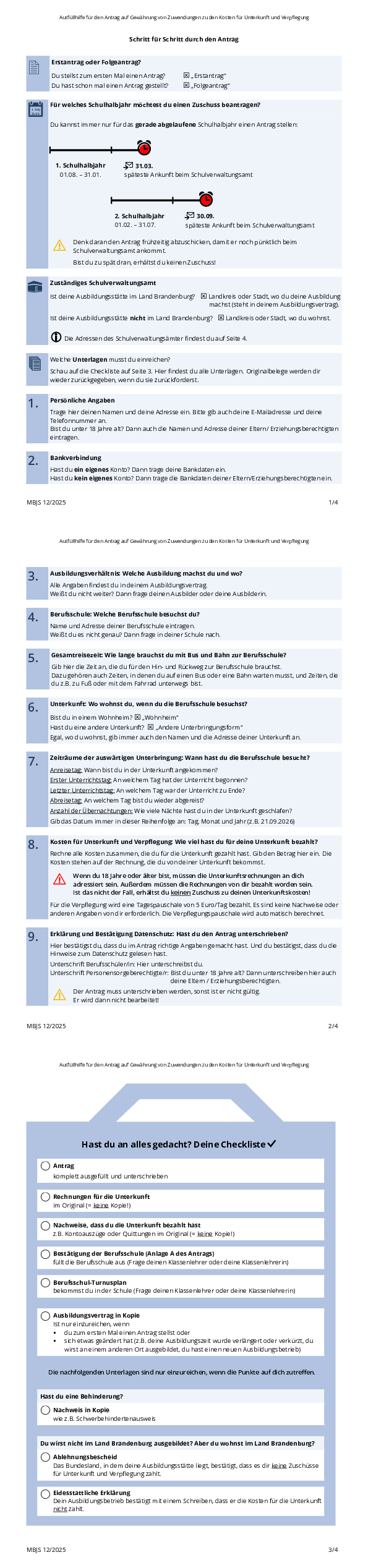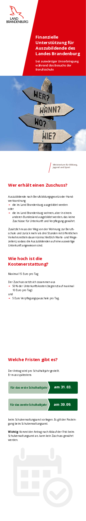 Hinweise zu den Anträgen auf Gewährung von Zuwendungen an Berufsschülerinnen und Berufsschüler zu den Kosten für Unterkunft und Verpflegung bei notwendiger auswärtiger Unterbringung