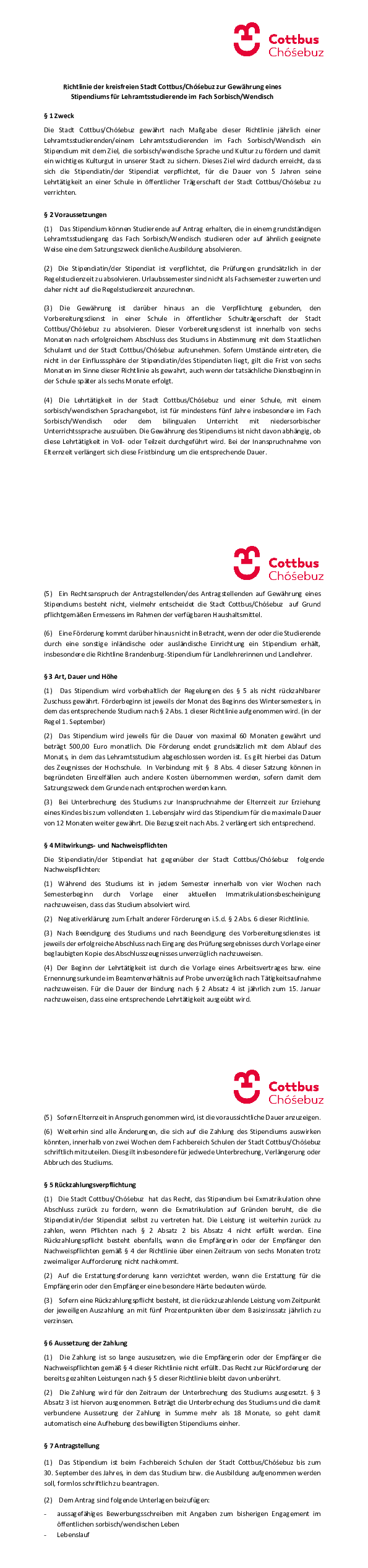 Richtlinie der kreisfreien Stadt Cottbus/Chóśebuz zur Gewährung eines Stipendiums für Lehramtsstudierende im Fach Sorbisch/Wendisch vom 16.07.2025