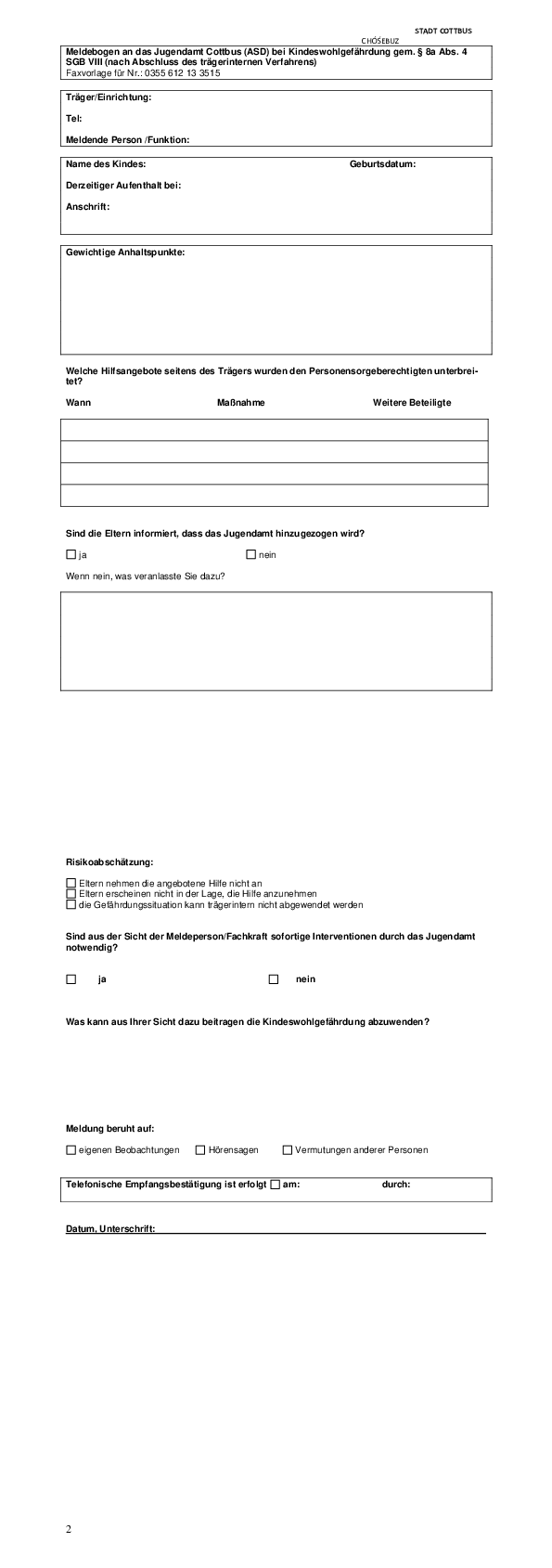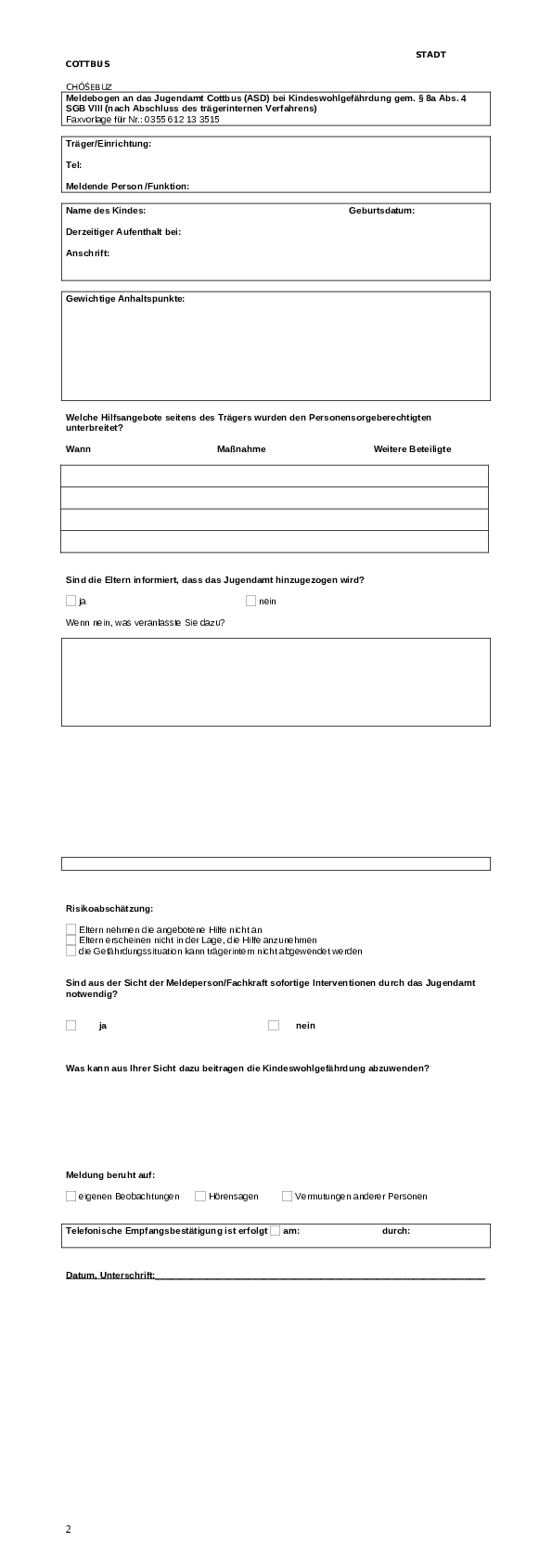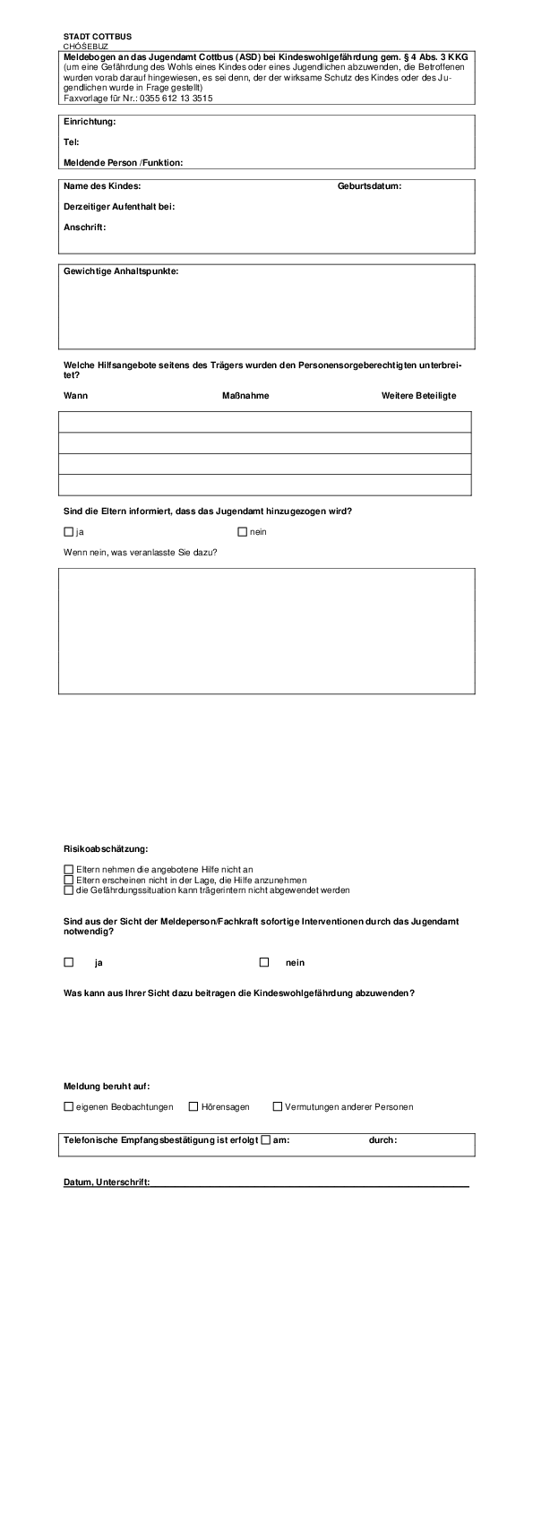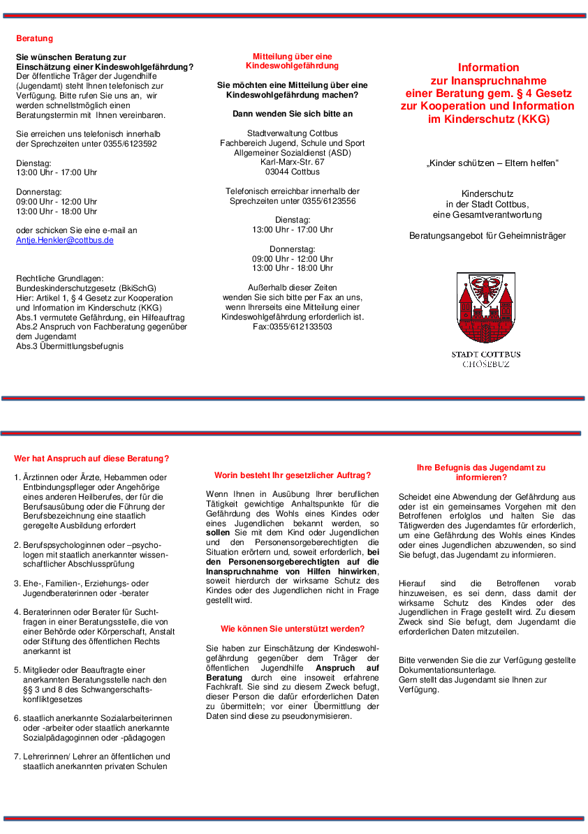 Das vorliegende Kinderschutzkonzept macht deutlich, dass sich Kinderschutz nicht nur auf die Fachkräfte der Kinder- und Jugendhilfe beschränkt. Neben der Vereinbarung zu verbindlichen Standards in der Umsetzung des § 8a SGB VIII- Schutzauftrag bei Kindeswohlgefährdung – ist es gelungen, ein tragfähiges Netzwerk Kinderschutz Cottbus aufzubauen (siehe Konzept S. 8) und auf dessen Grundlage gemeinsame Arbeitsstrukturen sowie Leitfäden, Dokumentationen und Vereinbarungen mit den Kooperationspartnern aus Bildung, Medizin, Polizei und Justiz zu erarbeitet werden konnten.