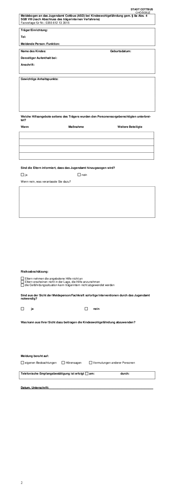 Die Verfassung des Landes Brandenburg (Art. 27 Abs. 3) sagt ausdrücklich, dass Kinder in besonderer Weise den Schutz von Staat und Gesellschaft genießen. Der Gesetzgeber hat mit der Novellierung des SGB VIII im Oktober 2005 und der Aufnahme des § 8a „Schutzauftrag bei Kindeswohlgefährdung“ die Handlungsweisen für das Jugendamt aber auch alle Dienste und Einrichtungen, die Leistungen nach dem Kinder- und Jugendhilfegesetz erbringen, festgeschrieben.