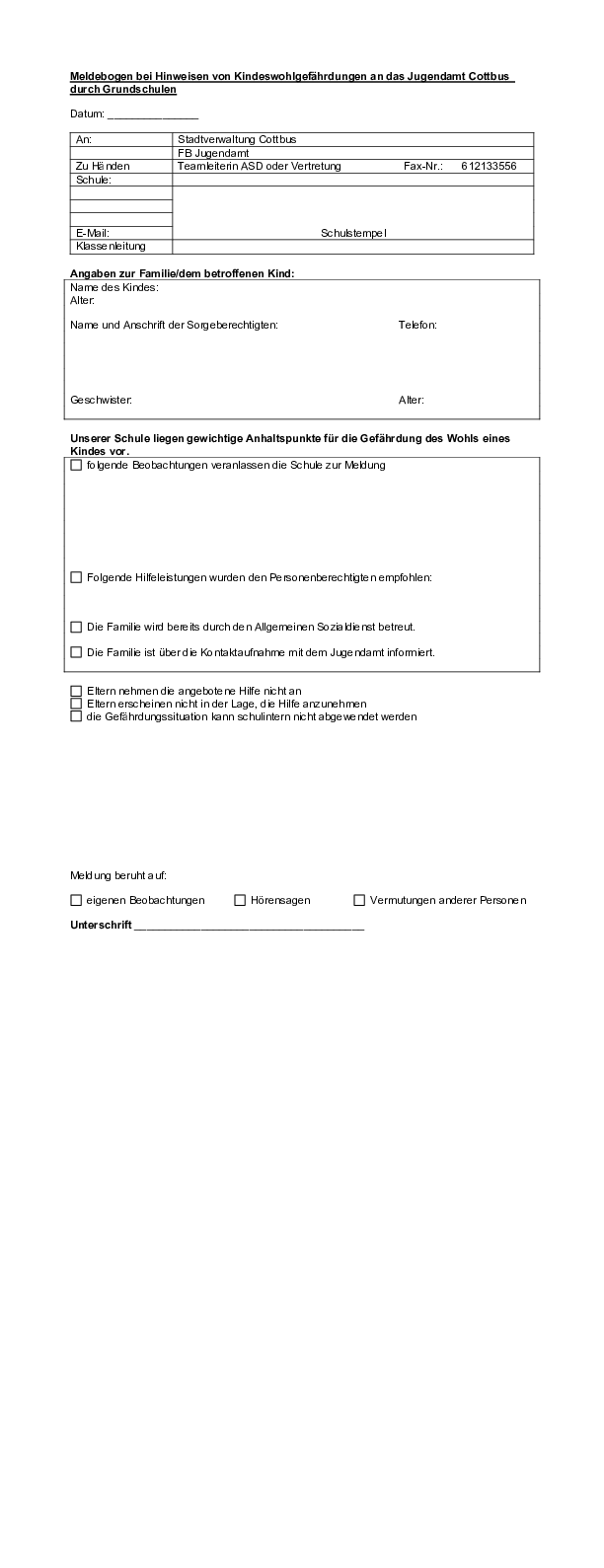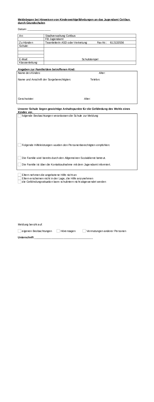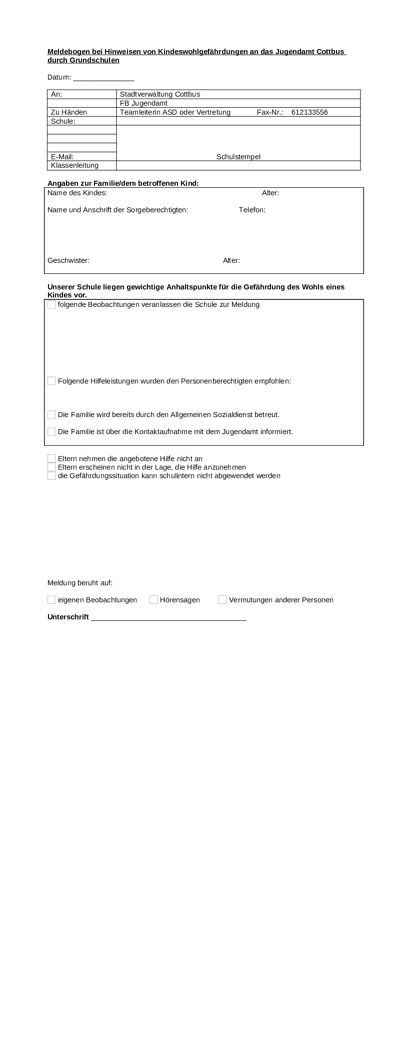 Basis für eine erfolgreiche Arbeit zwischen Jugendhilfe und Schule im Kinderschutz ist eine gelingende Kooperation zwischen beiden Institutionen. Dies setzt Kenntnisse über die Aufgaben, Möglichkeiten und Grenzen des jeweils anderen Partners sowie einen wertschätzenden Umgang miteinander voraus. Mit dieser Kooperationsvereinbarung werden schulinterne Verfahrensstandards für den Umgang mit Kindeswohlgefährdungen beschrieben. Außerdem wird eine verbindliche, transparente Struktur der Zusammenarbeit der Grundschulen der Stadt Cottbus und dem Fachbereich Jugend, Schule und Sport (Jugendamt) in Fällen von Kindeswohlgefährdung abgeschlossen. Langfristig sollen die Kooperationsvereinbarung und die Verfahrensstandards in gegebenenfalls differenzierter Form auf die weiterführenden und die Förderschulen übertragen werden.