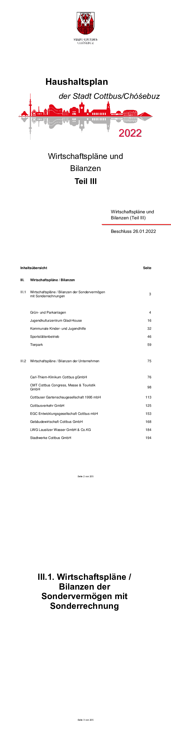 Hashaltsplan und Haushaltssatzung der Stadt Cottbus Chóśebuz für das Jahr 2022, Teil IA