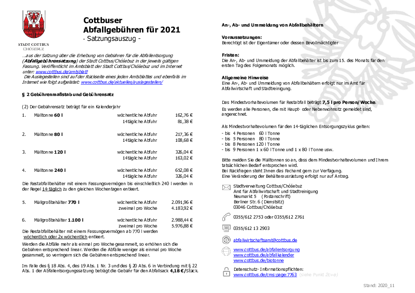 Erstellen von Gebührenbescheiden für die Benutzung der Restabfallentsorgungsanlagen: 0355 612-2794. Nähere Informationen dazu finden Sie unter der Rubrik: Restabfallentsorgungsanlagen, Punkt 2 UMLADESTATION oder auf Seite 18 im Cottbuser Abfallkalender.