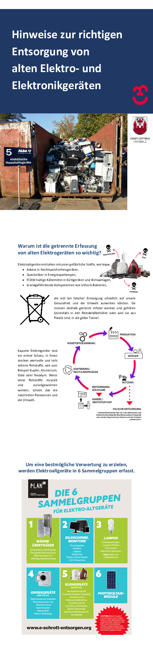 Die Abholung von Elektro- und Elektronikaltgeräten (EAGs) durch die ALBA Cottbus GmbH erfolgt kostenlos 2x pro Jahr direkt vor Ihrer Haustür. Bitte vereinbaren Sie vorher einen Termin unter: 0355 7508-700 ( HOLSYSTEM – Straßenrandsammlung). Zusätzlich ist die Abgabe möglich: