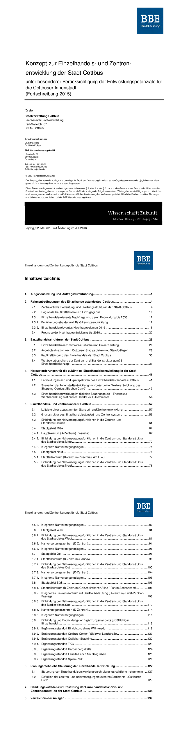 Konzept zur Einzelhandels- und Zentrenentwicklung der Stadt Cottbus 2015/2016