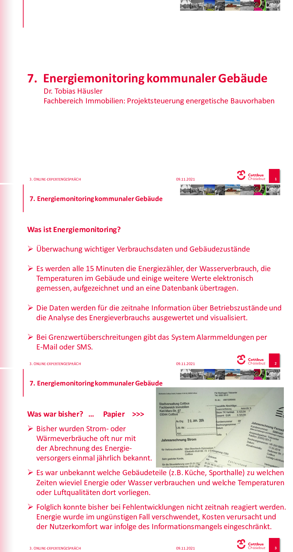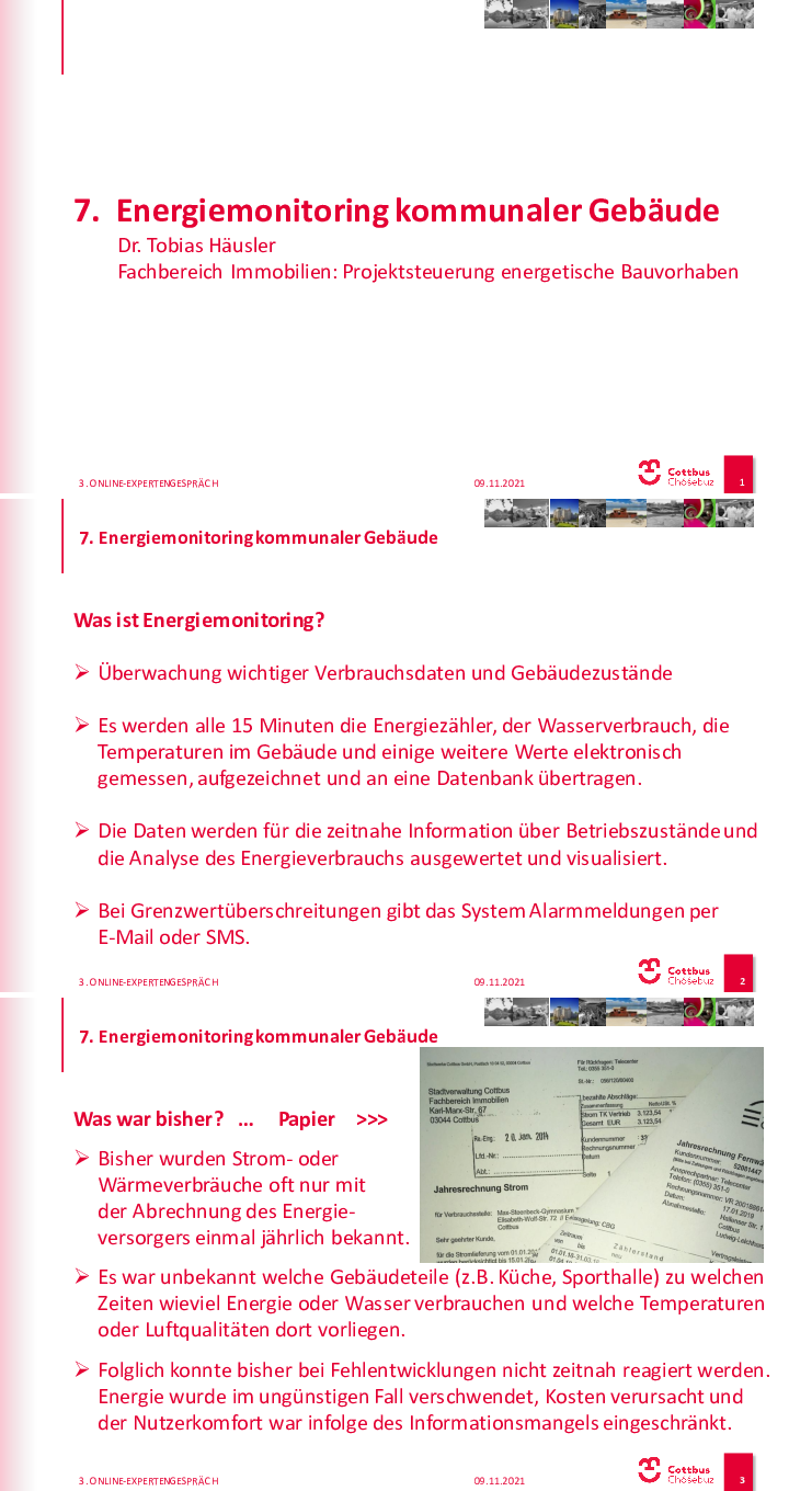 Am 09. November 2021 fand die Reihe der Expert*innengespräche die dritte Fortsetzung mit dem Schwerpunktthema „Umwelt, Erneuerbare Energien, Klimaschutz“ sein. Die besprochenen Themen reichten dabei von erneuerbare Energien und Mobilität, über die Anpassung an den Klimawandel aus Sicht der Landschaftsplanung bis hin zu nachhaltigen Stadtquartiere und die Instrumente einer klimagerechten Stadtplanung. Gleichzeitig stand das kommunale Klimaschutzmanagement, das energetisches Sanierungsmanagement sowie das Energiemonitoring kommunaler Gebäude im Rahmen von Smart City im Fokus der Veranstaltung.