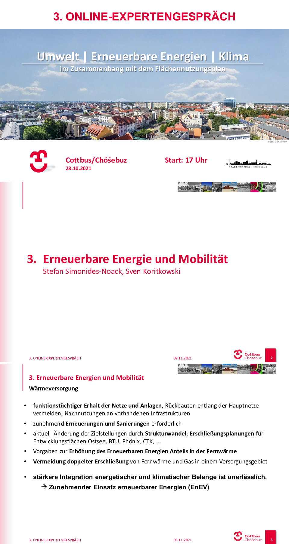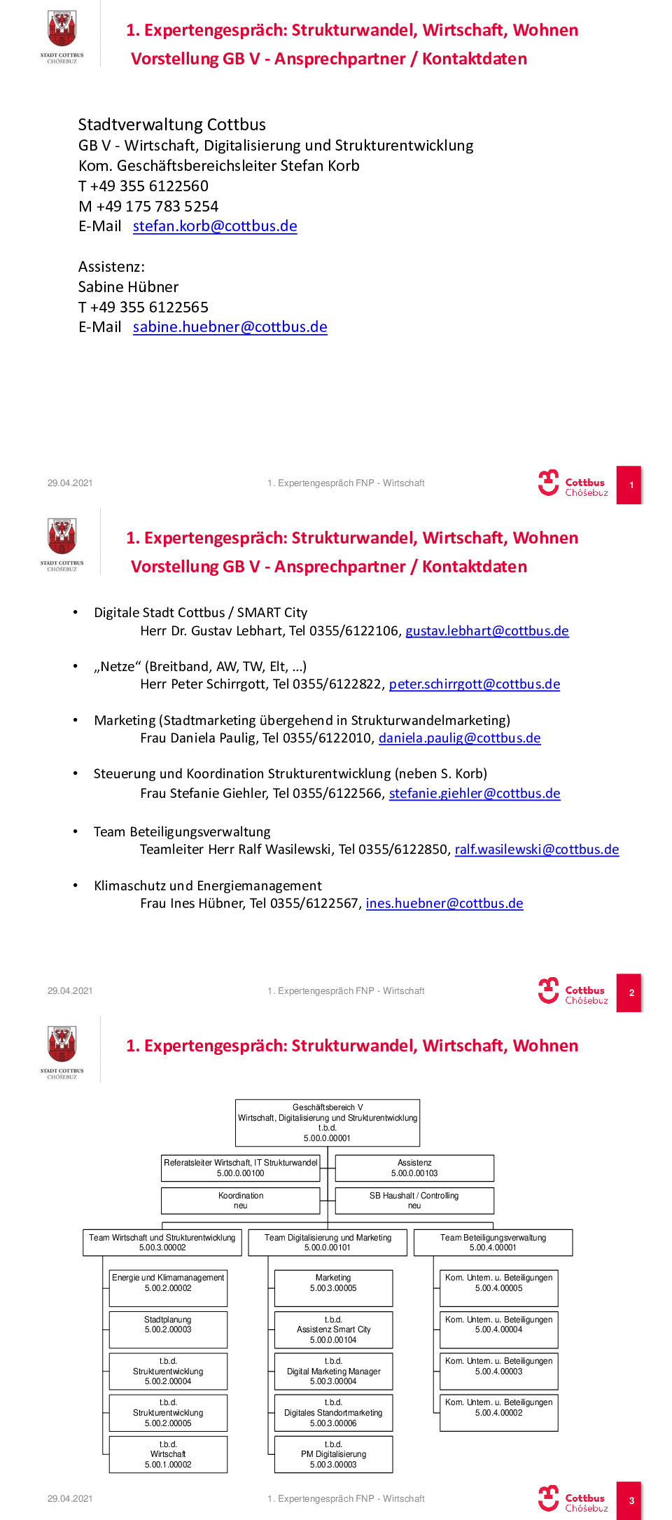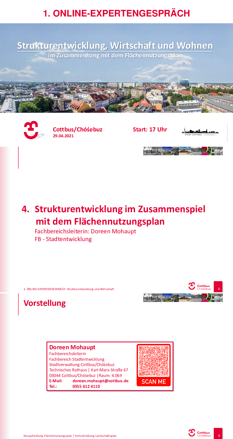 Am 29. April 2021 fand ein öffentliches Online–Expertengespräch in der Reihe „Strukturentwicklung, Wirtschaft und Wohnen im Zusammenhang mit dem Flächennutzungsplan“ statt. Bürgerinnen und Bürgern konnte sich für diese Veranstaltung anmelden, um direkt von verantwortlichen Vertretern der Wirtschaft und der Kommune über die konkreten Auswirkungen des Strukturwandels auf Cottbus/Chóśebuz informiert zu werden.