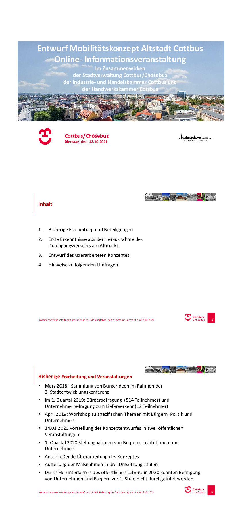 Zunächst fand ein gemeinsam von der IHK Cottbus und der Stadtverwaltung Cottbus/Chóśebuz organisierter Termin für Händler, Gastronomen und für weitere Unternehmer der Altstadt statt. Es folgte eine Bürgerversammlung im Saal des Stadthauses am Erich Kästner Platz 1.