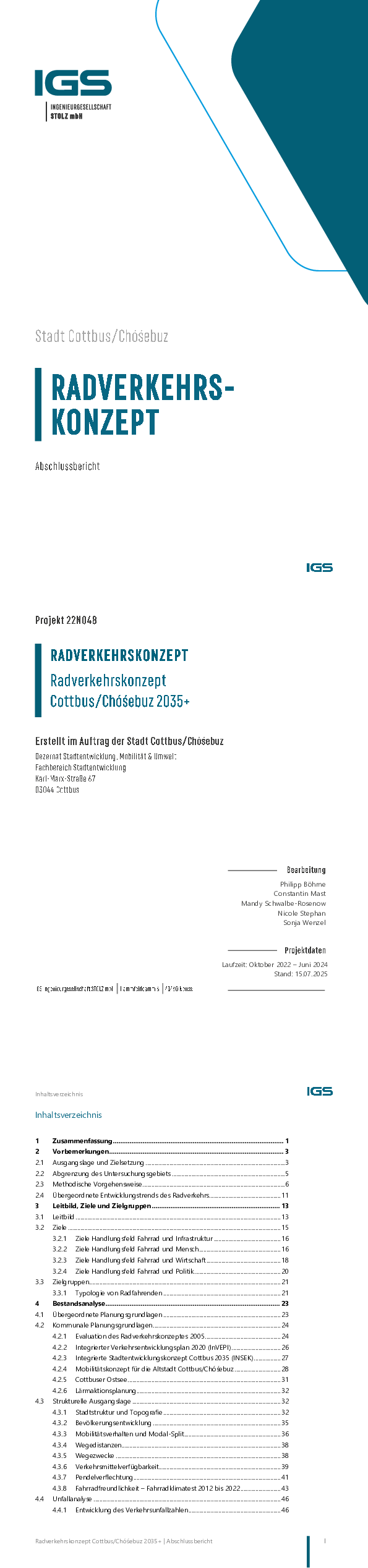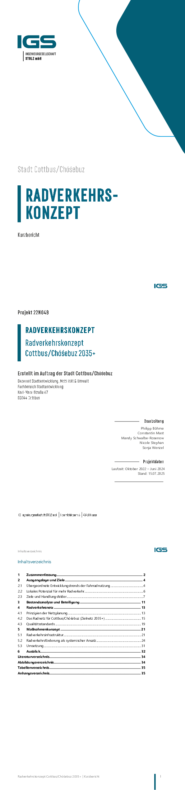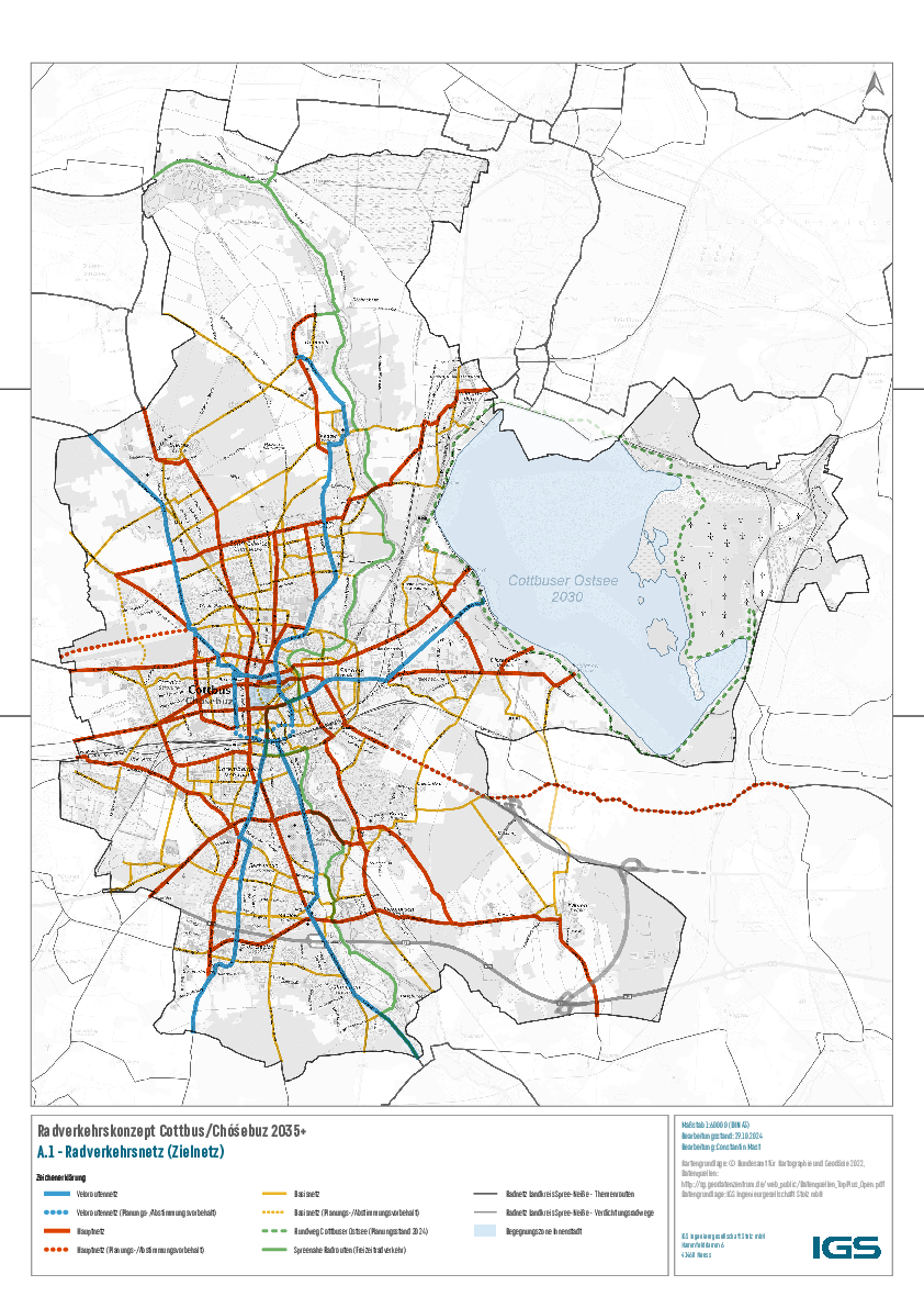 Mit dem Radverkehrskonzept Cottbus/Chóśebuz 2035+ liegt ein umfassender strategischer Rahmenplan der Radverkehrsförderung für die nächsten Jahre vor. Das Konzept gibt einen Überblick über die prioritären investiven Handlungsbedarfe und fungiert als wichtige Entscheidungshilfe bei der Prioritätensetzung von Maßnahmen.