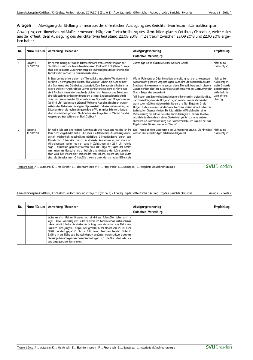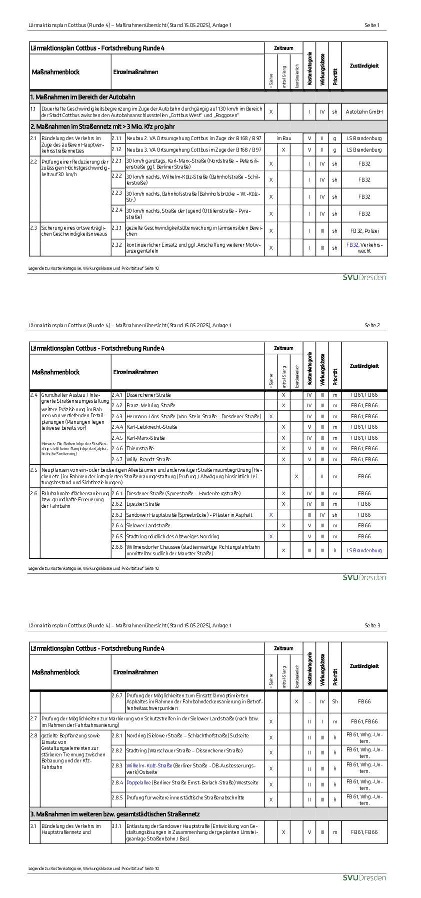 Der Lärmaktionsplan für die Stadt Cottbus/Chóśebuz wurde letztmalig im Jahr 2025 aktualisiert. In 2030 ist daher die nächste Überprüfung / Fortschreibung vorzunehmen.