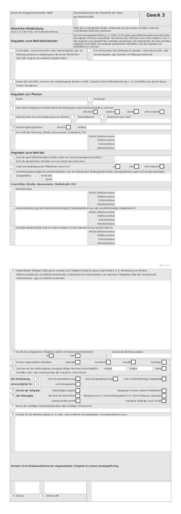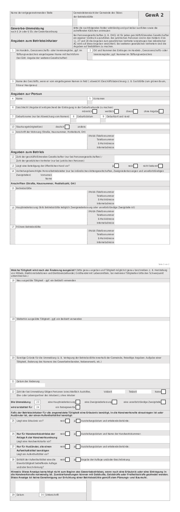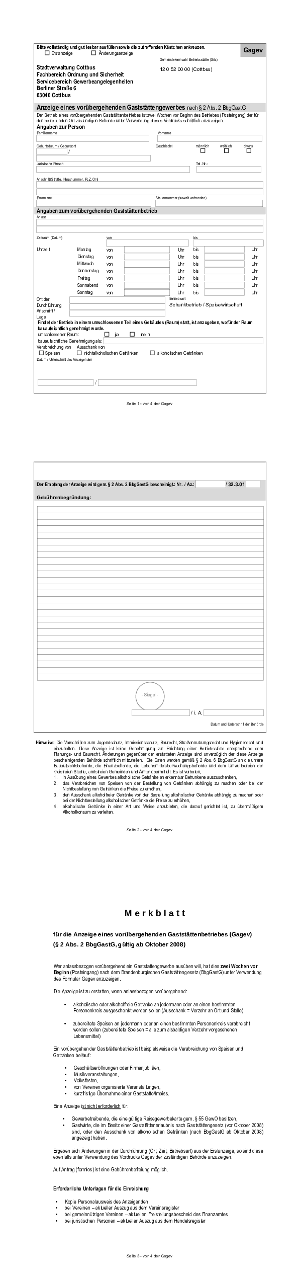 Für Anzeigen nach dem BbgGastG können Sie die beigefügten Formulare GewA1 für die Gewerbeanmeldung, GewA2 für die Gewerbeummeldung und GewA3 für die Gewerbeabmeldung nutzen. Für die Anzeige eines vorübergehenden Gaststättengewerbes nutzen Sie bitte das Gagev Formular.