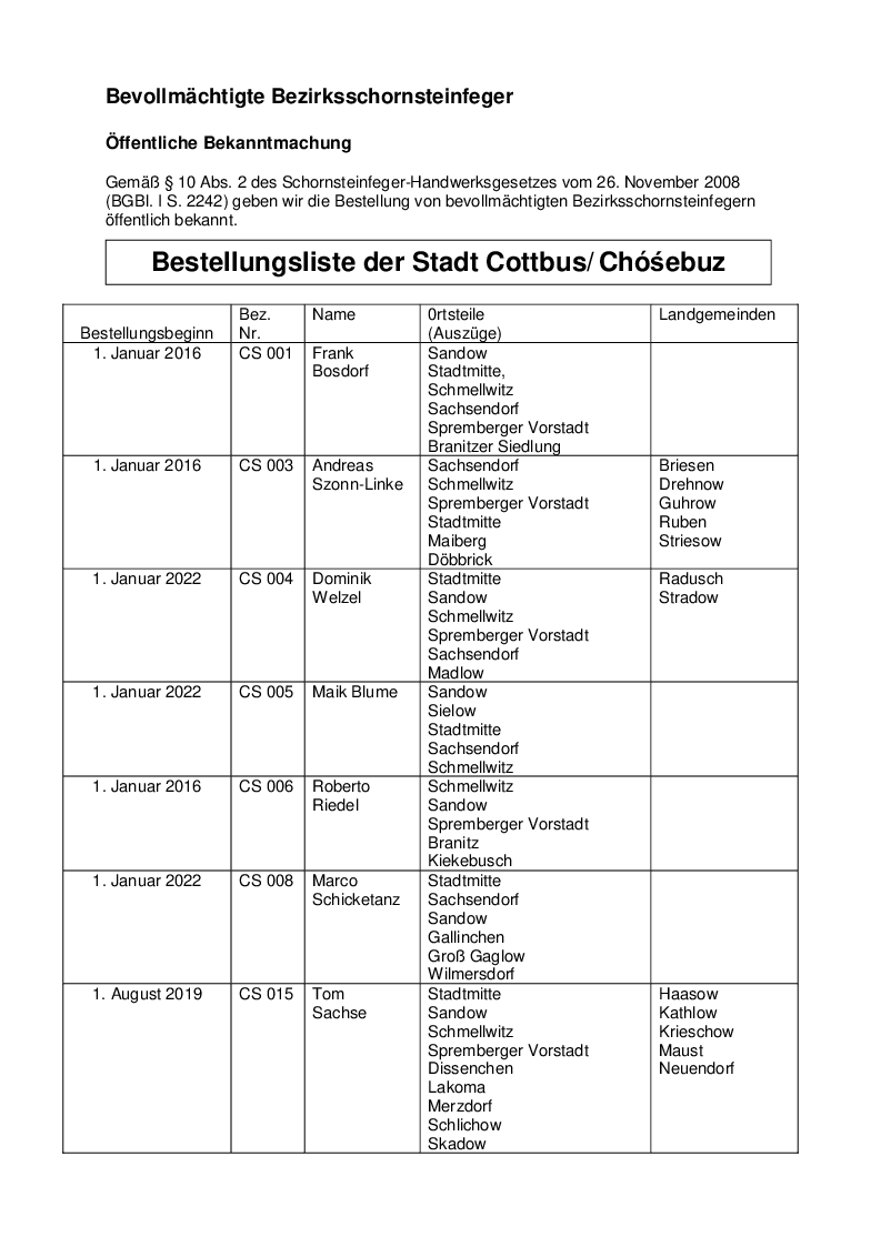 Die Kreisfreie Stadt Cottbus ist die Stelle, die für die Bezirke im Zuständigkeitsbereich der Stadt Cottbus die Ausschreibung sowie die Auswahl der Bewerber vornimmt und die bevollmächtigten Bezirksschornsteinfegerinnen/bevollmächtigte Bezirksschornsteinfeger bestellt (Bestellungsbehörde).