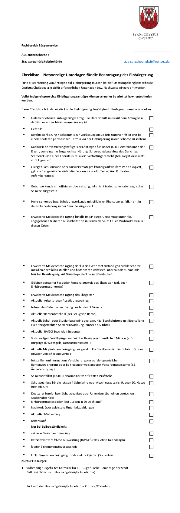 Genauere Auskünfte erhalten Sie in der Staatsangehörigkeitsbehörde Cottbus/ Chóśebuz.