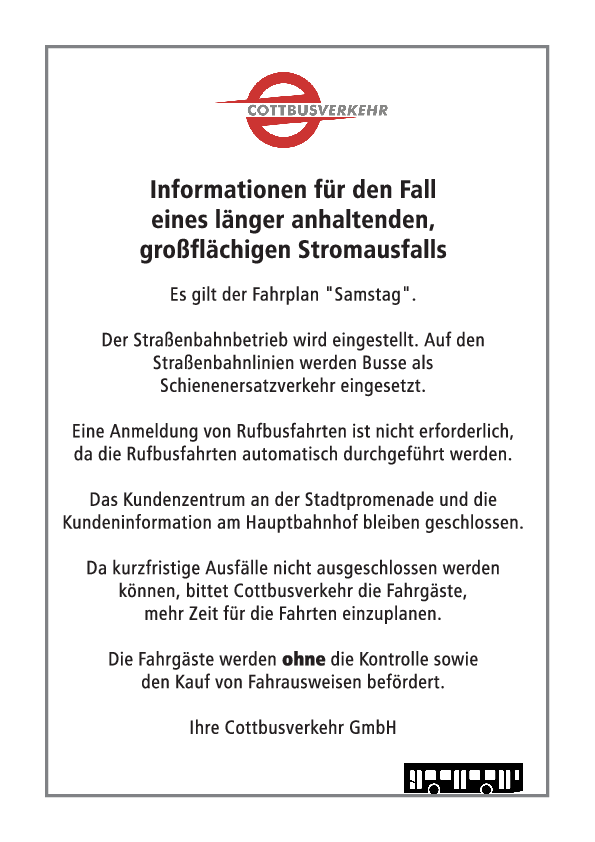 Cottbusverkehr: Informationen für den Fall eines länger anhaltenden, großflächigen Stromausfalls