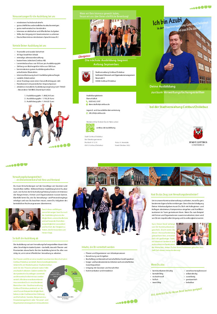 Von unseren künftigen Auszubildenden erwarten wir großes Interesse an städtischen und öffentlichen Angelegenheiten, Einsatzbereitschaft und Kommunikationsfähigkeit. Englische und slawische Sprachkenntnisse sind erwünscht. Für kaufmännische Ausbildungen sind Grundkenntnisse und -fertigkeiten im Umgang mit dem PC und im Maschine schreiben vorteilhaft.