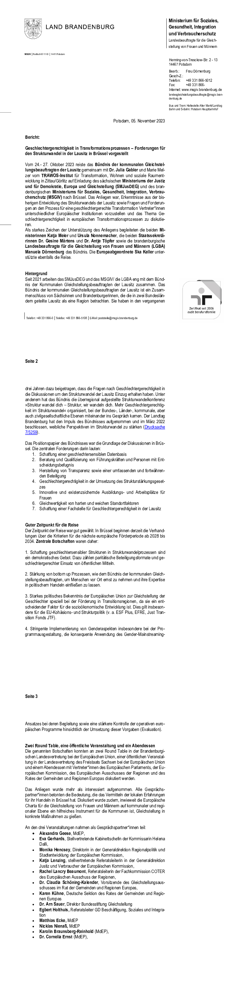 Bericht: Geschlechtergerechtigkeit in Transformationsprozessen – Forderungen für den Strukturwandel in der Lausitz in Brüssel vorgestellt