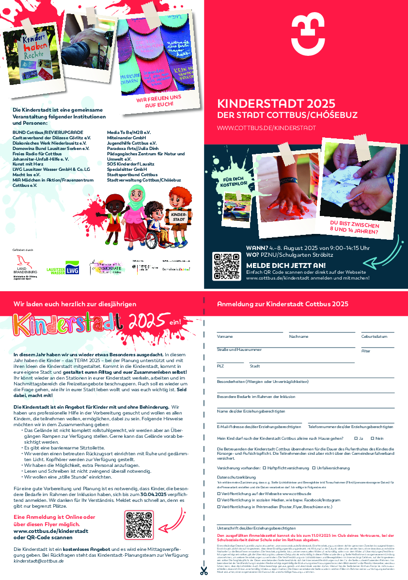 Die Kinderstadt 2026 findet vom 27. – 31. Juli 2026 auf dem Gelände des JUKS e.V., Kantstr.34b, 03050 Cottbus.