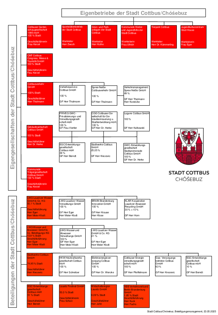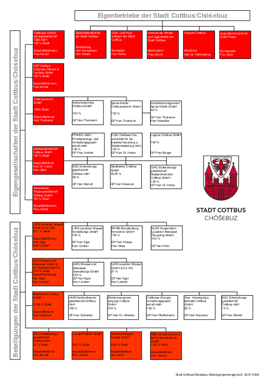 Als Gesellschafterin ist die Stadt Cottbus/Chóśebuz unmittelbar und mittelbar unter anderem an kommunalen Unternehmen in den Bereichen Ver- und Entsorgung, Kultur, Sport, Gesundheit, Wohnungswesen, Messen und Veranstaltungen, Freizeit, Verkehr, Kinderbetreuung und Wirtschaftsförderung beteiligt. Ein erfolgreiches Agieren der Unternehmen erfordert ein gutes Zusammenspiel zwischen der Stadt Cottbus/Chóśebuz, den Mitgesellschaftern, den Aufsichtsräten/Werksausschüssen und der Geschäftsführung/Werkleitung der Unternehmen. Das Beteiligungsmanagement hat hier die Rolle eines Bindeglieds zwischen den genannten Akteuren und unterstützt die Rathausspitze sowie die Entscheidungsträger in ihrer Steuerungsverantwortung und sichert die Überwachung und Unterstützung der städtischen Unternehmen.