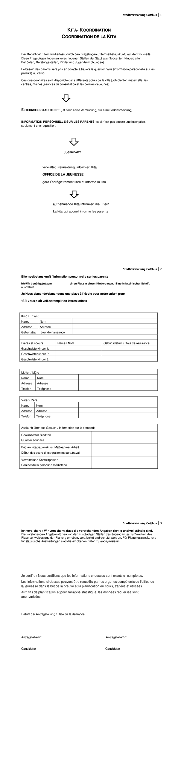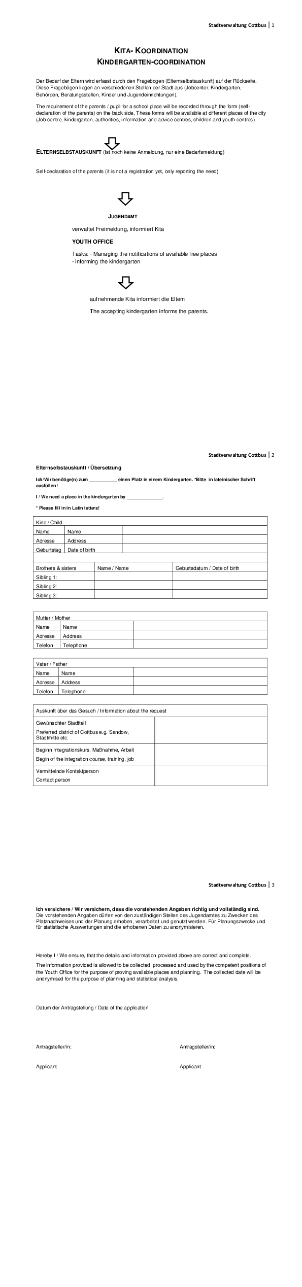 Der Bedarf der Eltern wird durch den hier zur Verfügung gestellten Fragebogen (Elternselbstauskunft) erfasst. Es handelt sich dabei noch nicht um die Anmeldung des Kindes in einer bestimmten Kita.