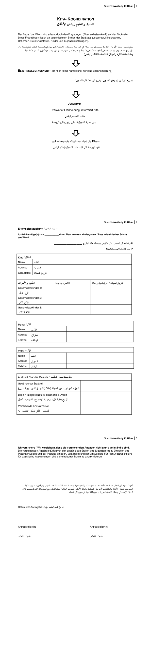 Ziel der Stadt Cottbus ist es, Flüchtlingskinder und -jugendliche nach Ankunft in unserer Stadt schnellstmöglich zu integrieren, hierzu zählt auch der Besuch einer Kindertagesstätte. Die hier in verschiedenen Sprachen zum Download zur Verfügung stehenden Formulare sind ein Hilfsmittel, um die Anmeldeformalitäten trotz Sprachbarrieren rechtssicher und auch für die Geflüchteten verständlich vorzunehmen.