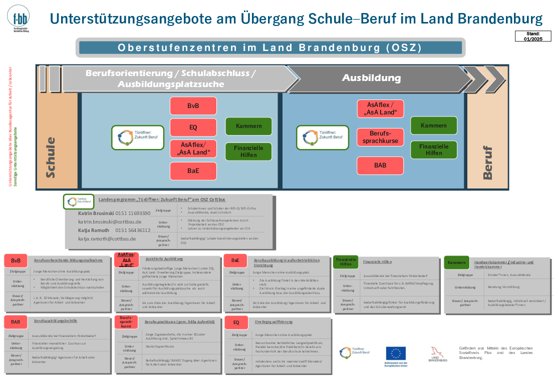 „Türöffner: Zukunft Beruf“ ist ein Landesprogramm des Ministeriums für Bildung, Jugend und Sport und wird aus Mitteln des Europäischen Sozialfonds Plus und des Landes Brandenburg gefördert. Ziel des Landesprogrammes ist es, die berufliche Integration von Jugendlichen am Übergang Schule – Beruf durch auf den Lernort Oberstufenzentrum (OSZ) bezogene Maßnahmen zu unterstützen.
